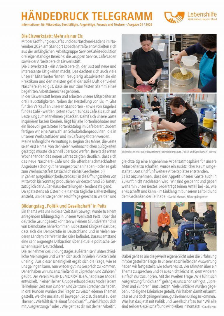 Die Eiswerkstatt: Mehr als nur Eis. Bildungstag „Politik und Gesellschaft“ in Peitz. Neue CNC-Fräse fördert Produktion & Mitarbeiter. Neues vom Biohof Auguste. Dankesschreiben von NewSeed. Einladung zum Lebenshilfe Café in der Nascherei. Dankeschön für tolle Weihnachtsfeier. Jahrestreffen von Geschäftsführung und Werkstattrat. Julia Briesemann und Anna-Sophia Metag per Steckbrief vorgestellt. Klaus Peter Scholz herzlich verabschiedet. „Inklusion als Teamaufgabe 2025“ - Urkunde für SGB 9. Berufliche Bildung für alle: Die Vorstellung der Methode „Projekt“. Traueranzeigen. Märchenhafter Adventszauber in der Nascherei. Mitarbeiter übernehmen Malerarbeiten in der WOD. Kreatives Arbeiten mit Ton. „Wunder Zauber und Magie“ - Mit der LW beim Fasching in Kolkwitz. Weihnachtsjahrmarkt mit großem Theater in Peitz. Stimmungsvoller Advent auf den Höfen in Burg.