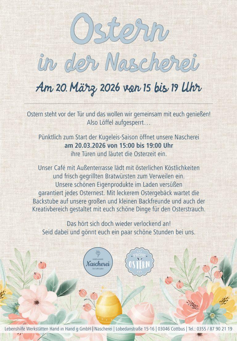 Pünktlich zum Start der Kugeleis-Saison öffnet unsere Nascherei am 20.03.2026 von 15:00 bis 19:00 Uhr ihre Türen und läutet die Osterzeit ein.